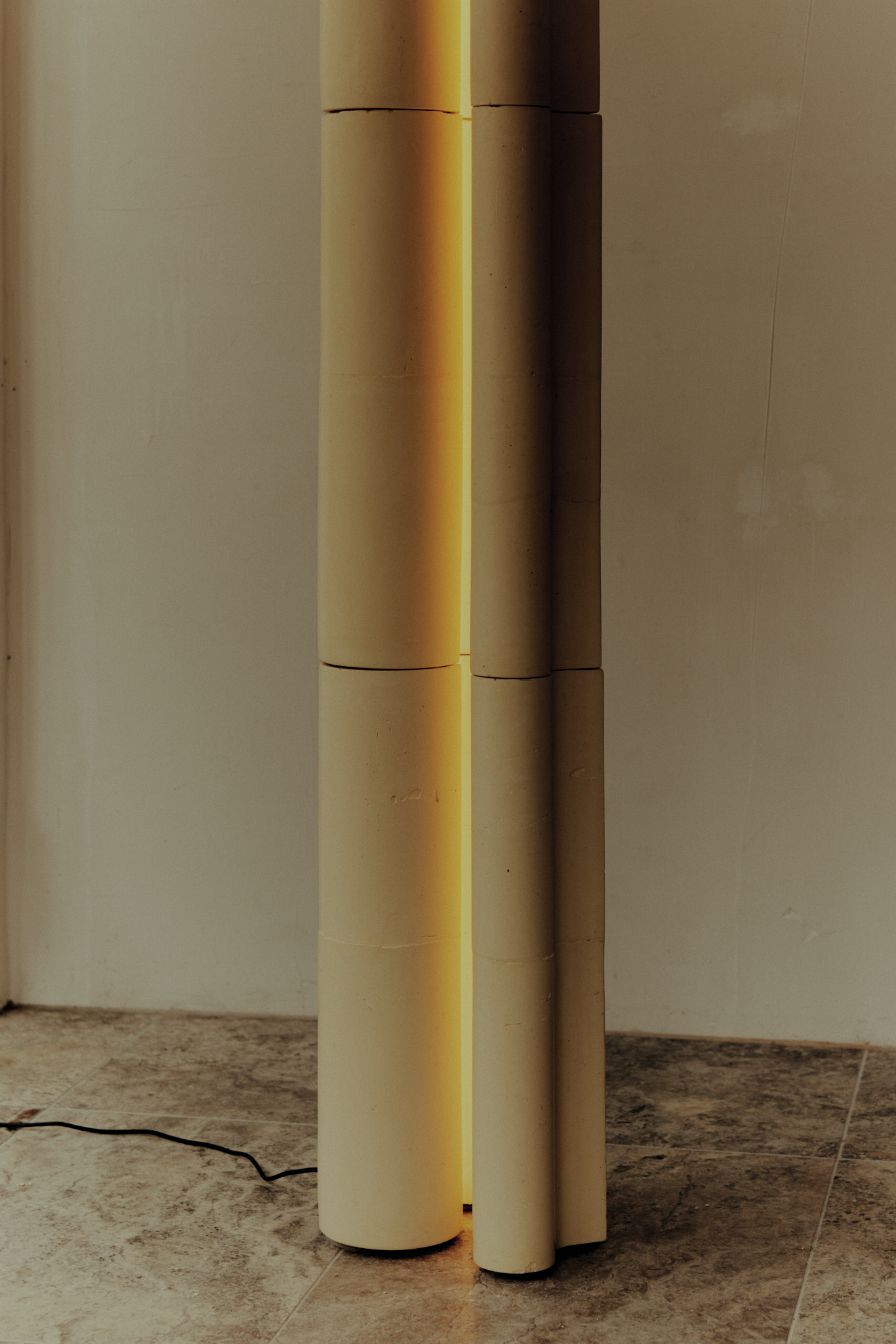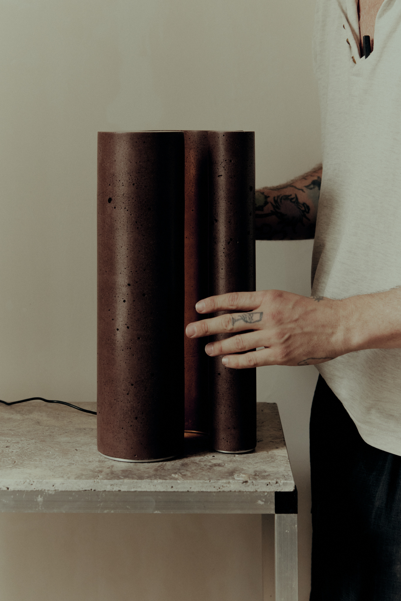 Anchored by a new lighting collection, the exhibition reimagines the architectural cornice, that most familiar of interior gestures, as an object of illumination. Cast, moulded, and hand-finished in concrete composite composed of recycled marble aggregate and dust, metal, and glass, each work becomes a meditation on how light and material behave, how scale shifts perception, and how structure can move from the monumental to the delicate with a turn of the hand.