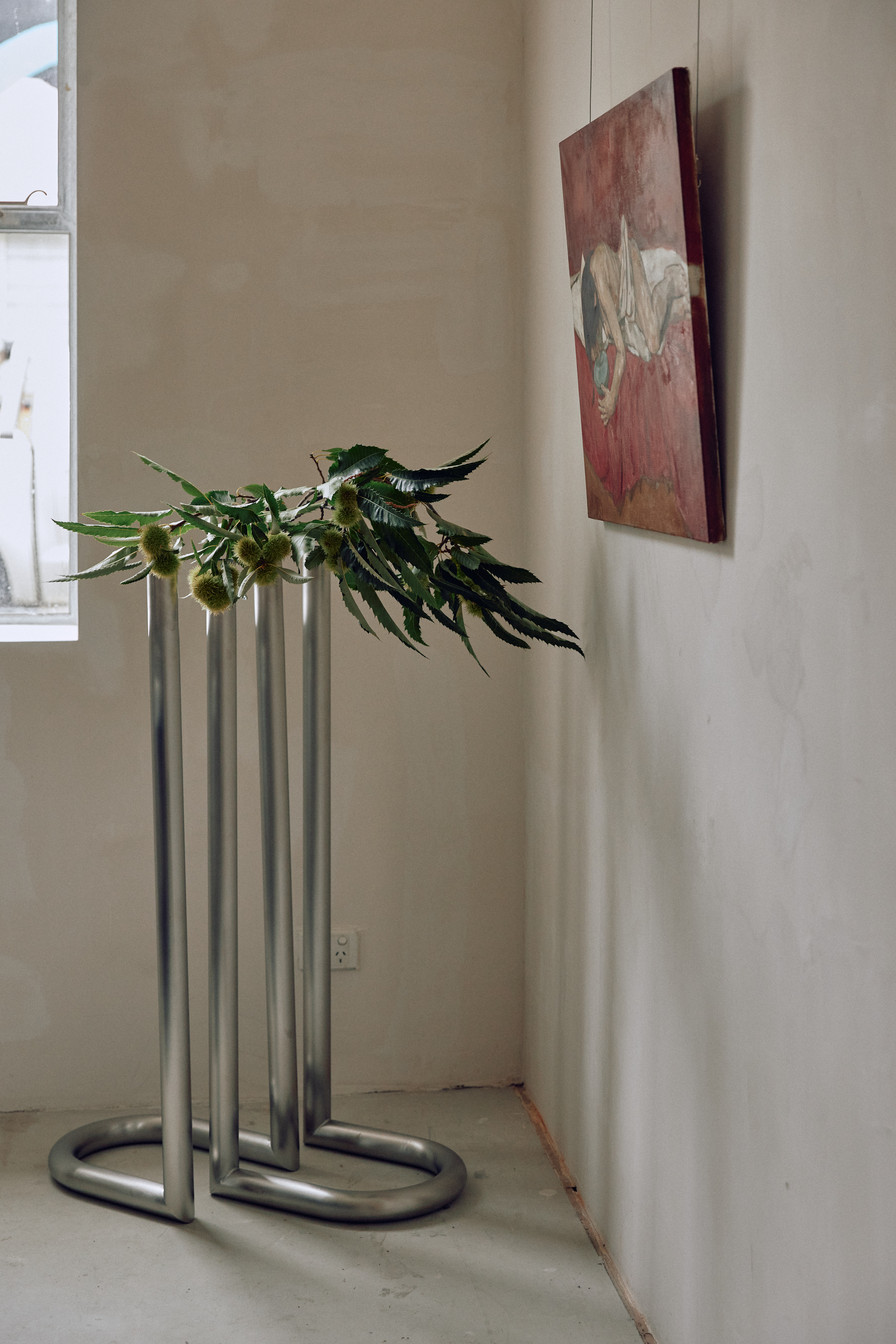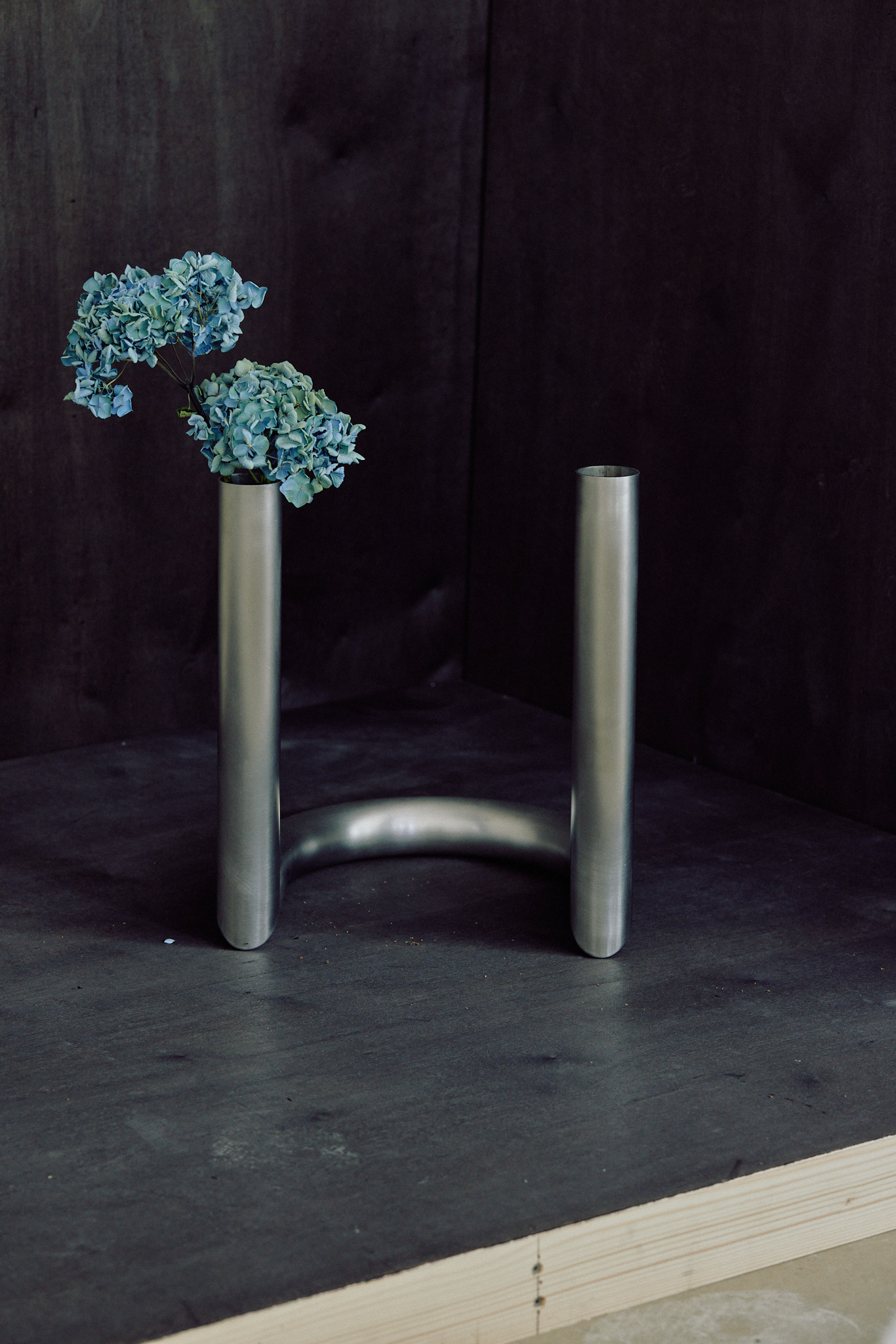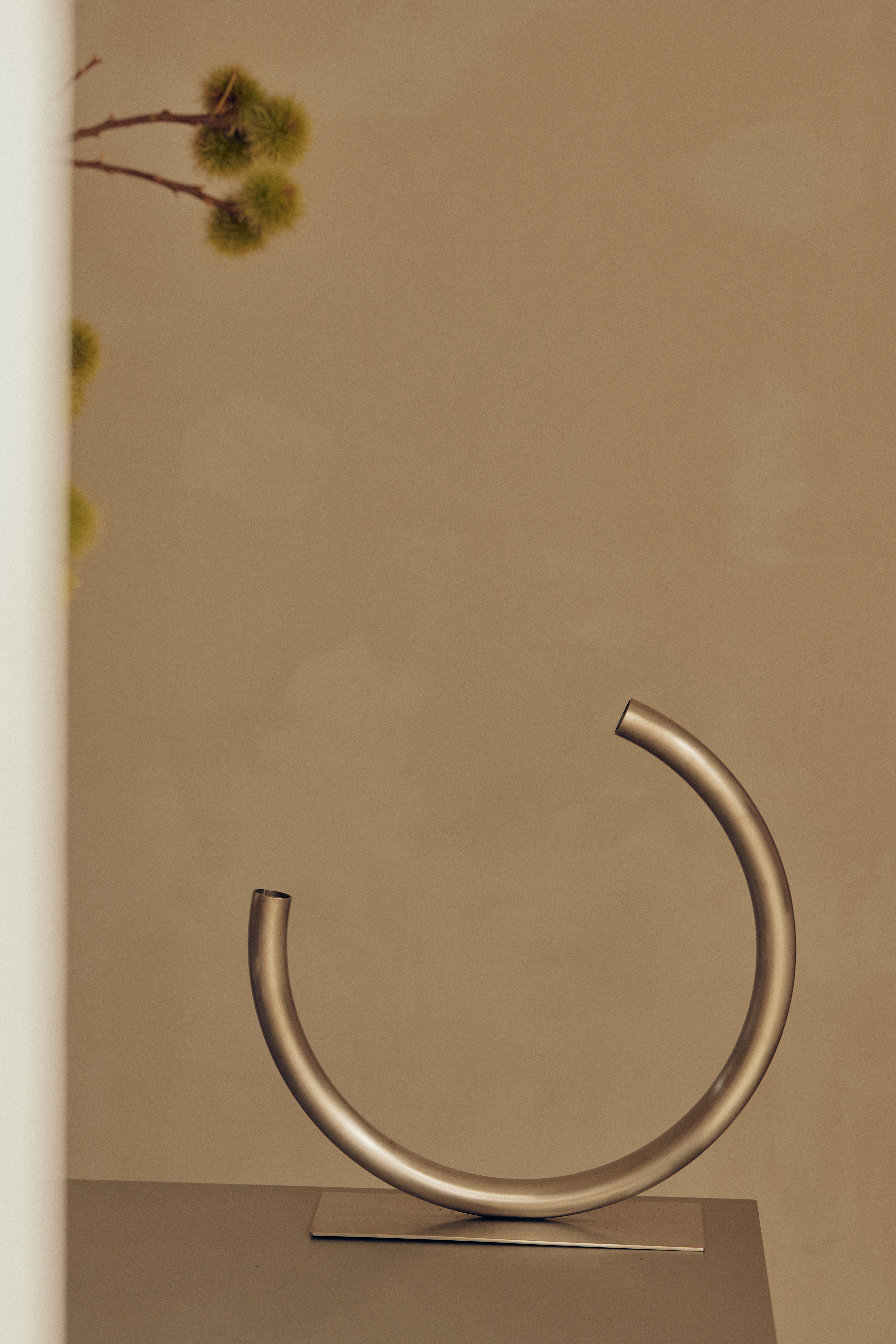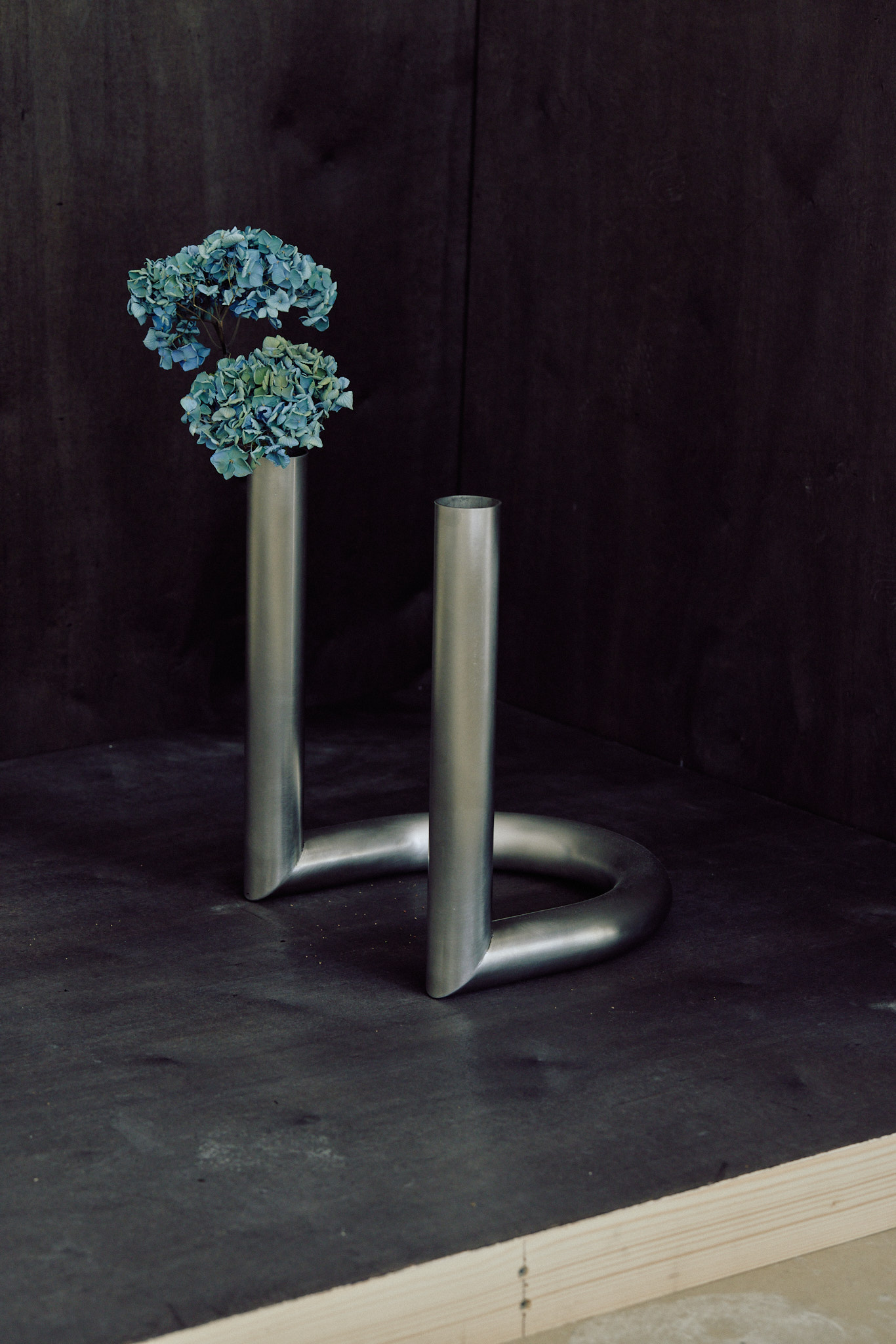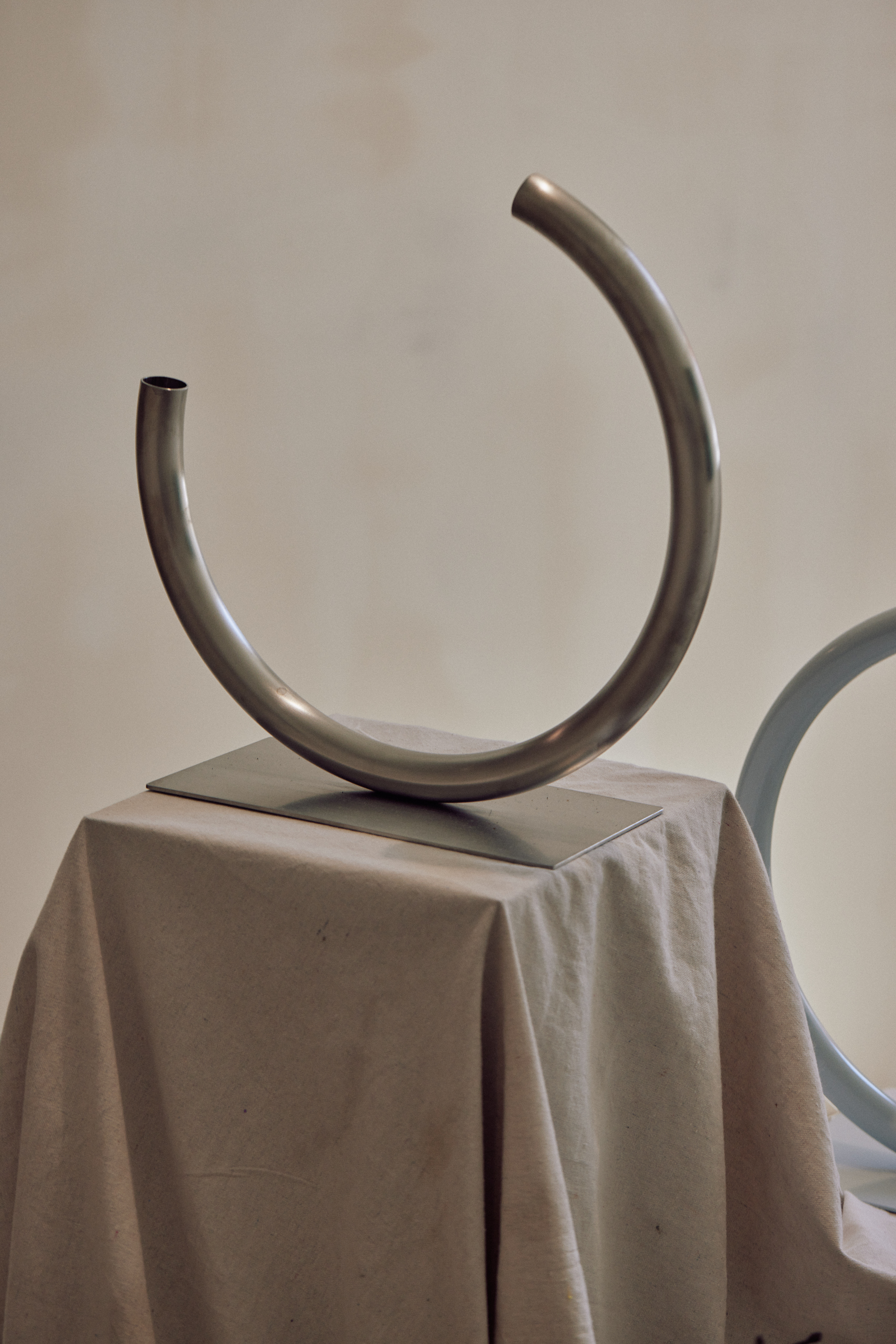 Conceived as intriguing sculptural forms that also perform as vessel bodies, Anna Varendorff’s latest collection of pieces presented at Oigåll are an ongoing extension of her established practice. With their solid materiality, formed by hand from stainless steel and brass - and their clean, negotiated compositions of tight curves, gentle loops and long rigid lines - Varendorff crafts objects that stand alone as examples of brilliant, thoughtful design, while also existing in a beguiling dialogue with the organic, rambling cuttings and flowers that they often display. Having evolved in scale and function over time, these forms also engage directly with the viewer, extending flora and foliage above the head and offering new vantages of display and perspective.