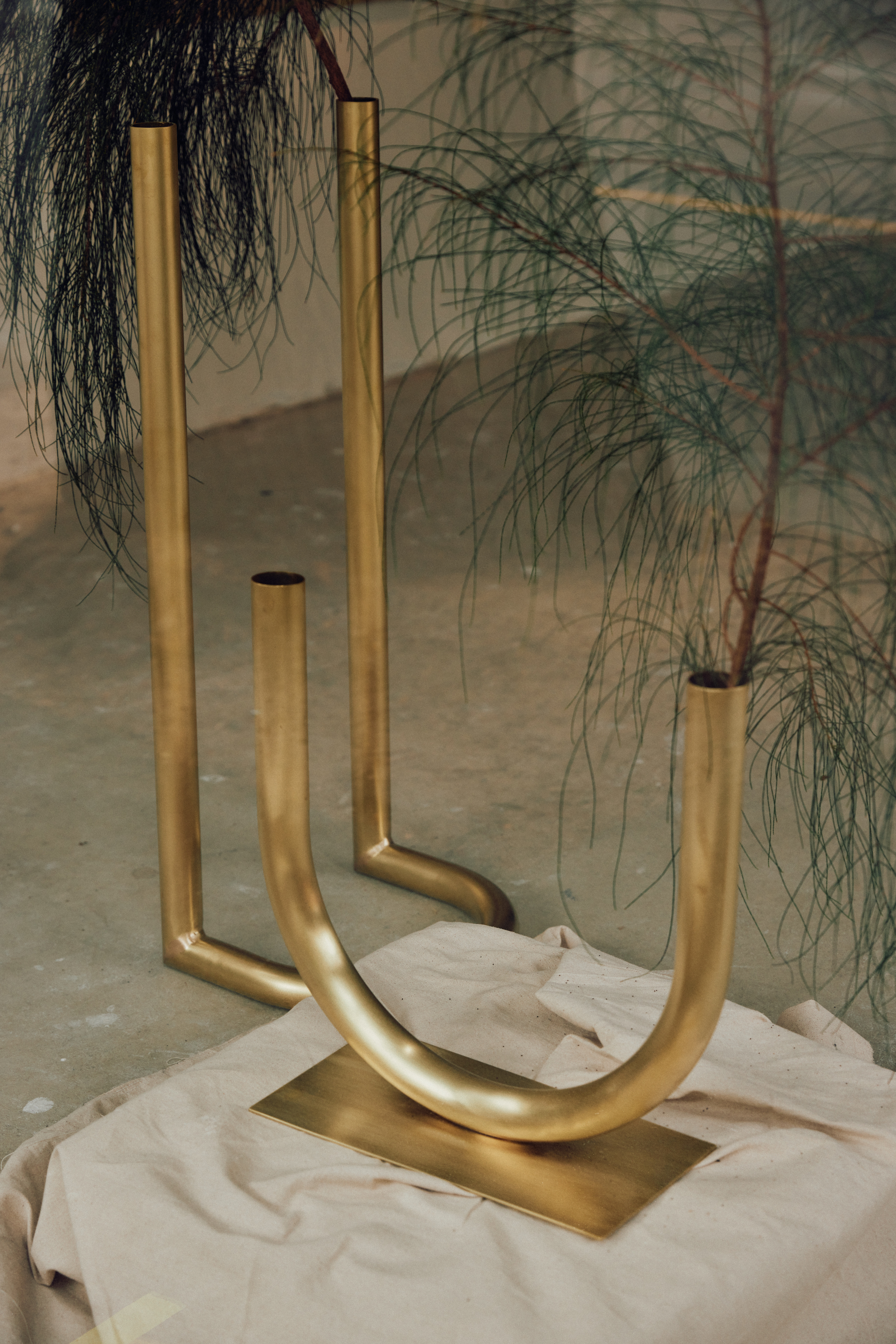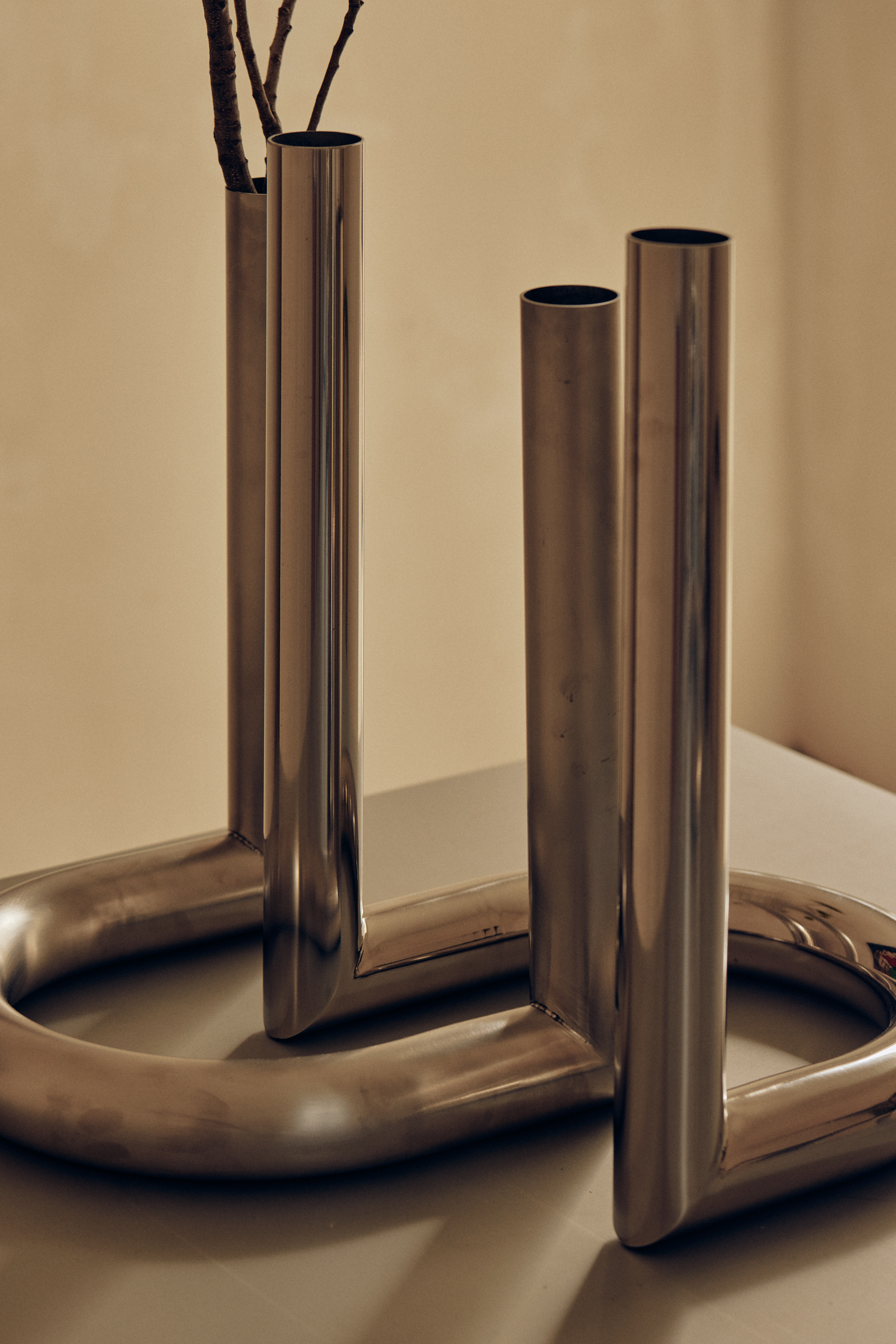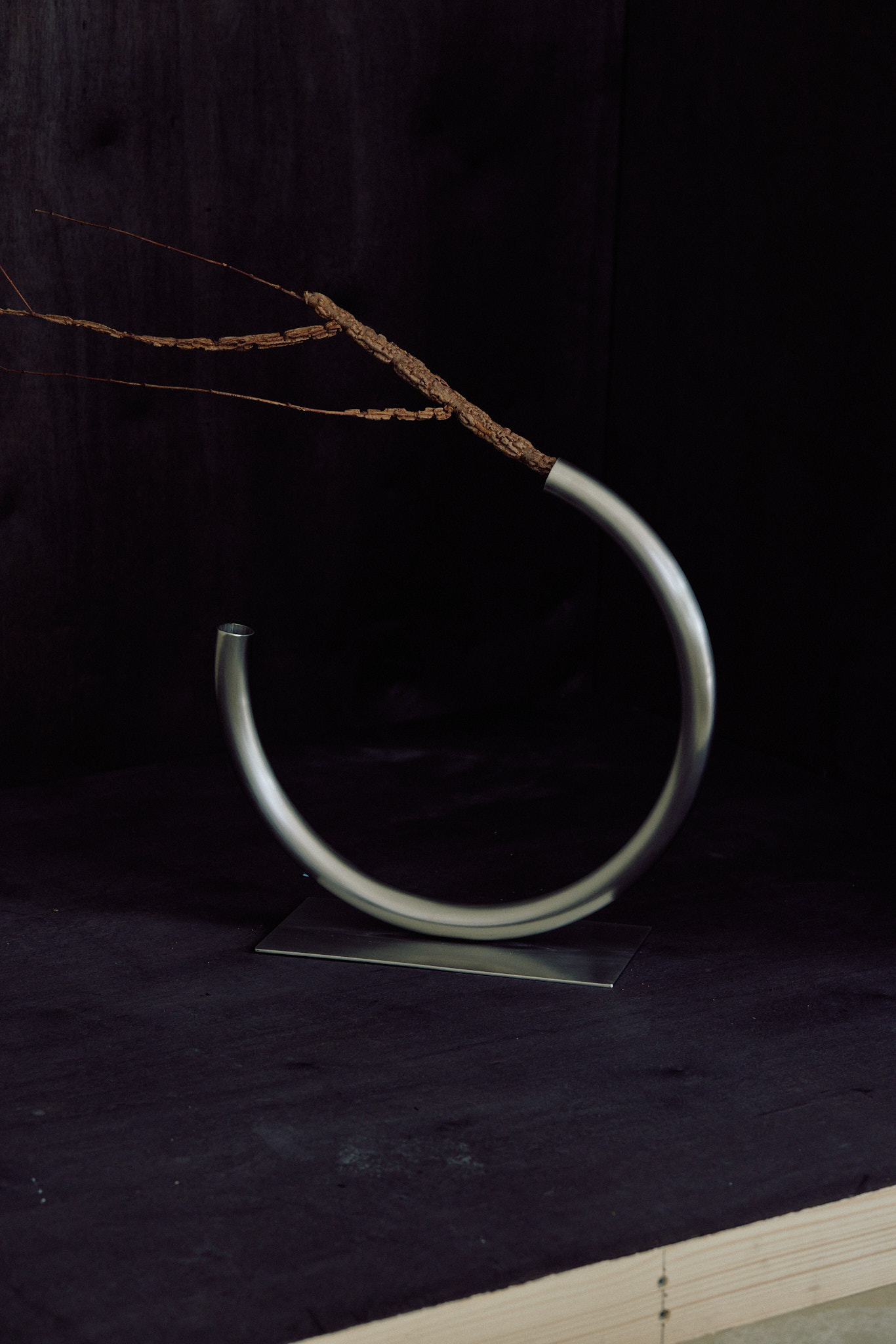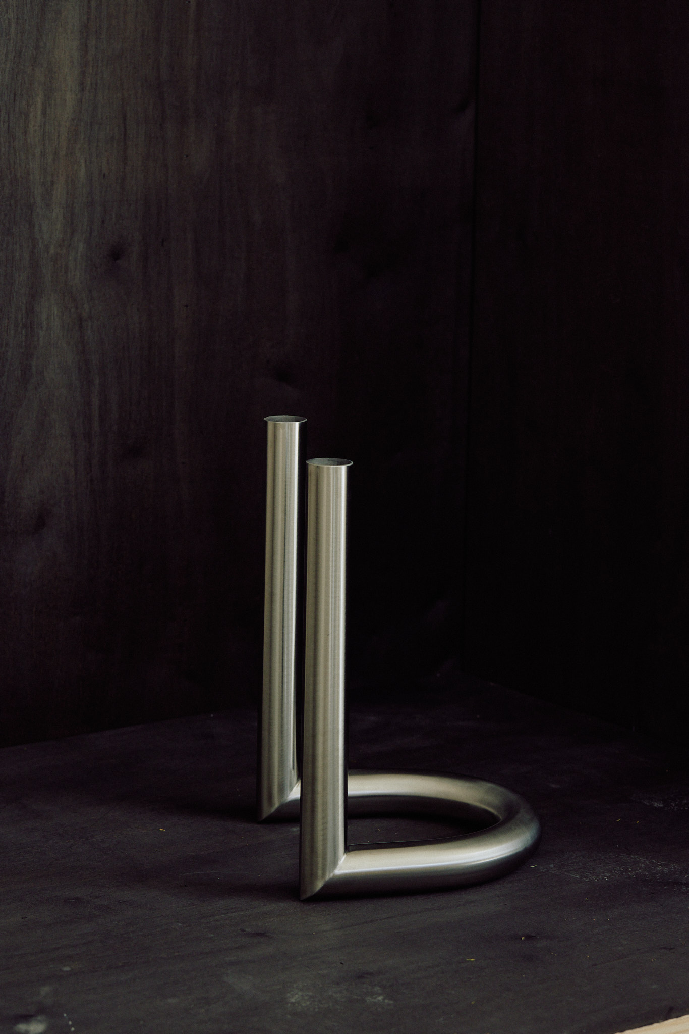 Conceived as intriguing sculptural forms that also perform as vessel bodies, Anna Varendorff’s latest collection of pieces presented at Oigåll are an ongoing extension of her established practice. With their solid materiality, formed by hand from stainless steel and brass - and their clean, negotiated compositions of tight curves, gentle loops and long rigid lines - Varendorff crafts objects that stand alone as examples of brilliant, thoughtful design, while also existing in a beguiling dialogue with the organic, rambling cuttings and flowers that they often display. Having evolved in scale and function over time, these forms also engage directly with the viewer, extending flora and foliage above the head and offering new vantages of display and perspective.