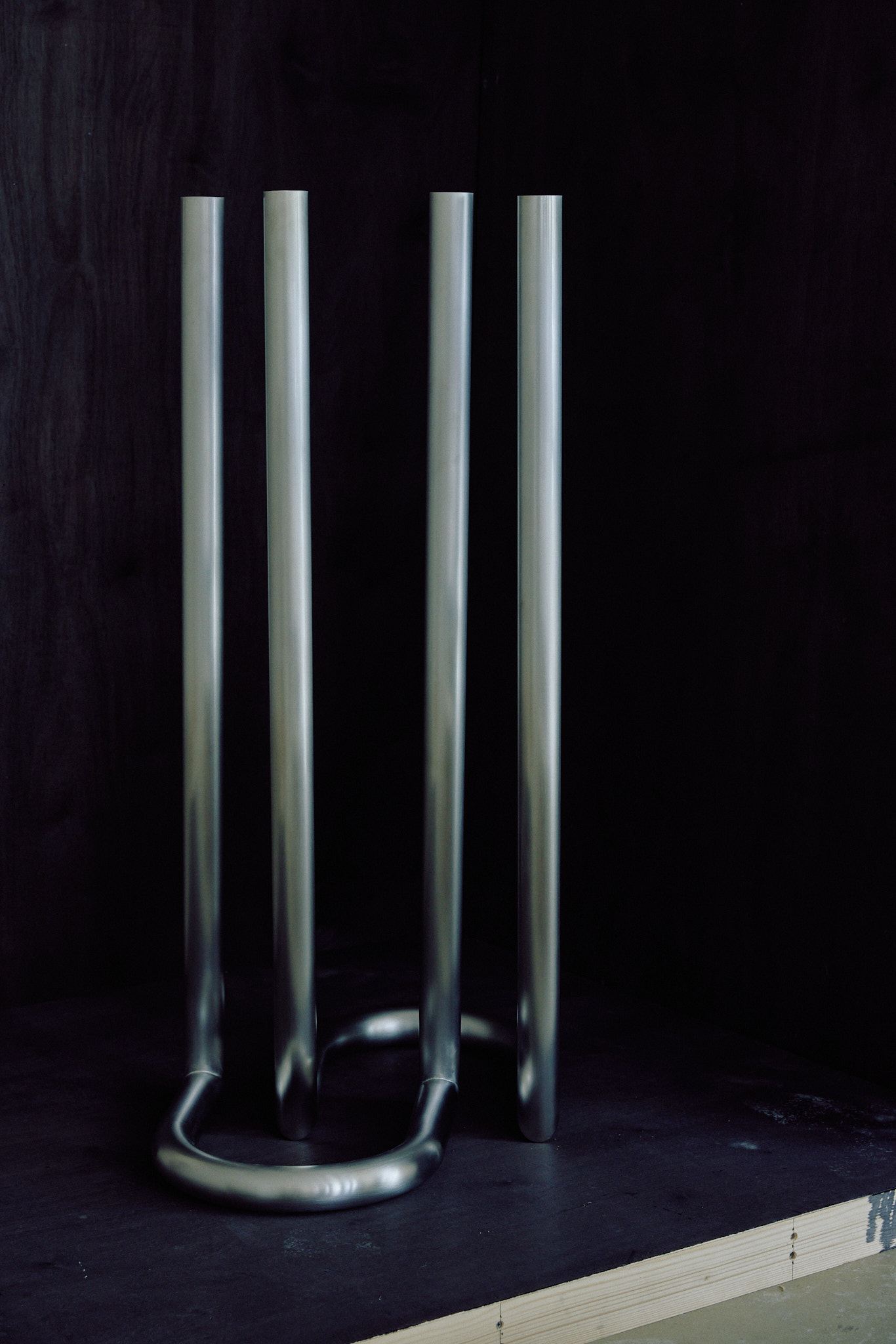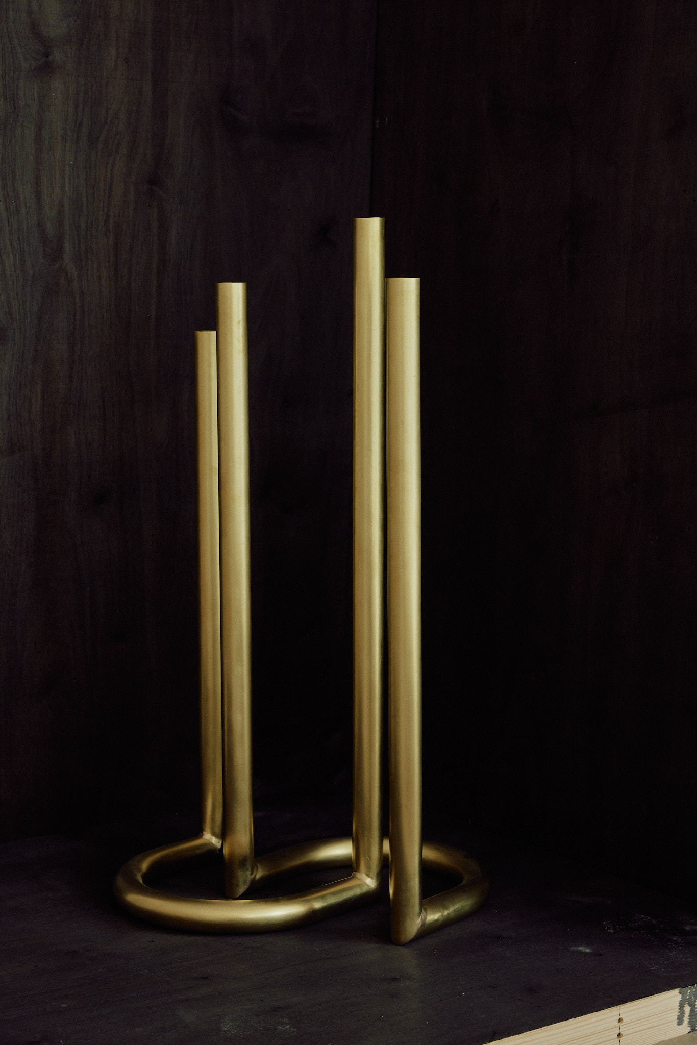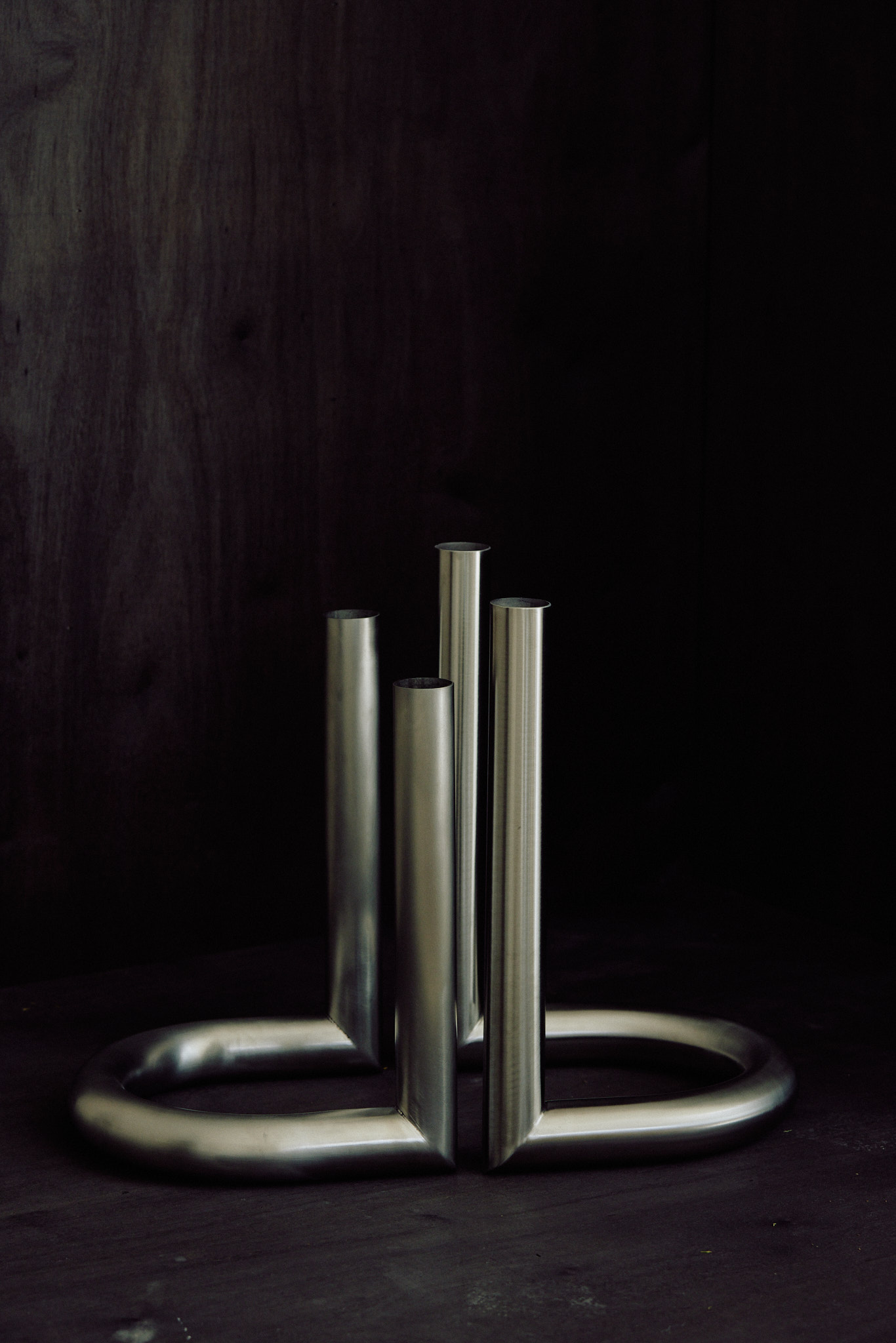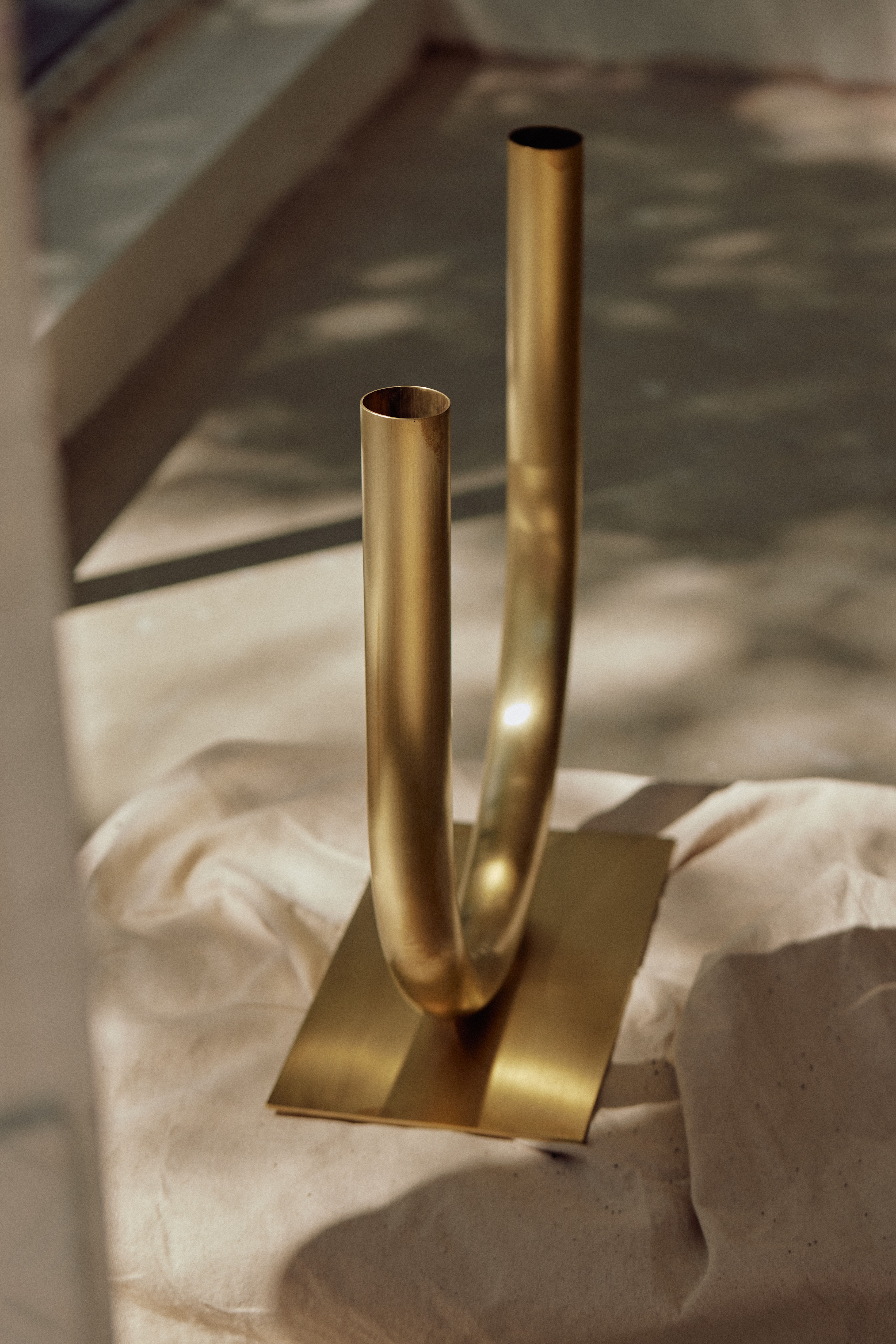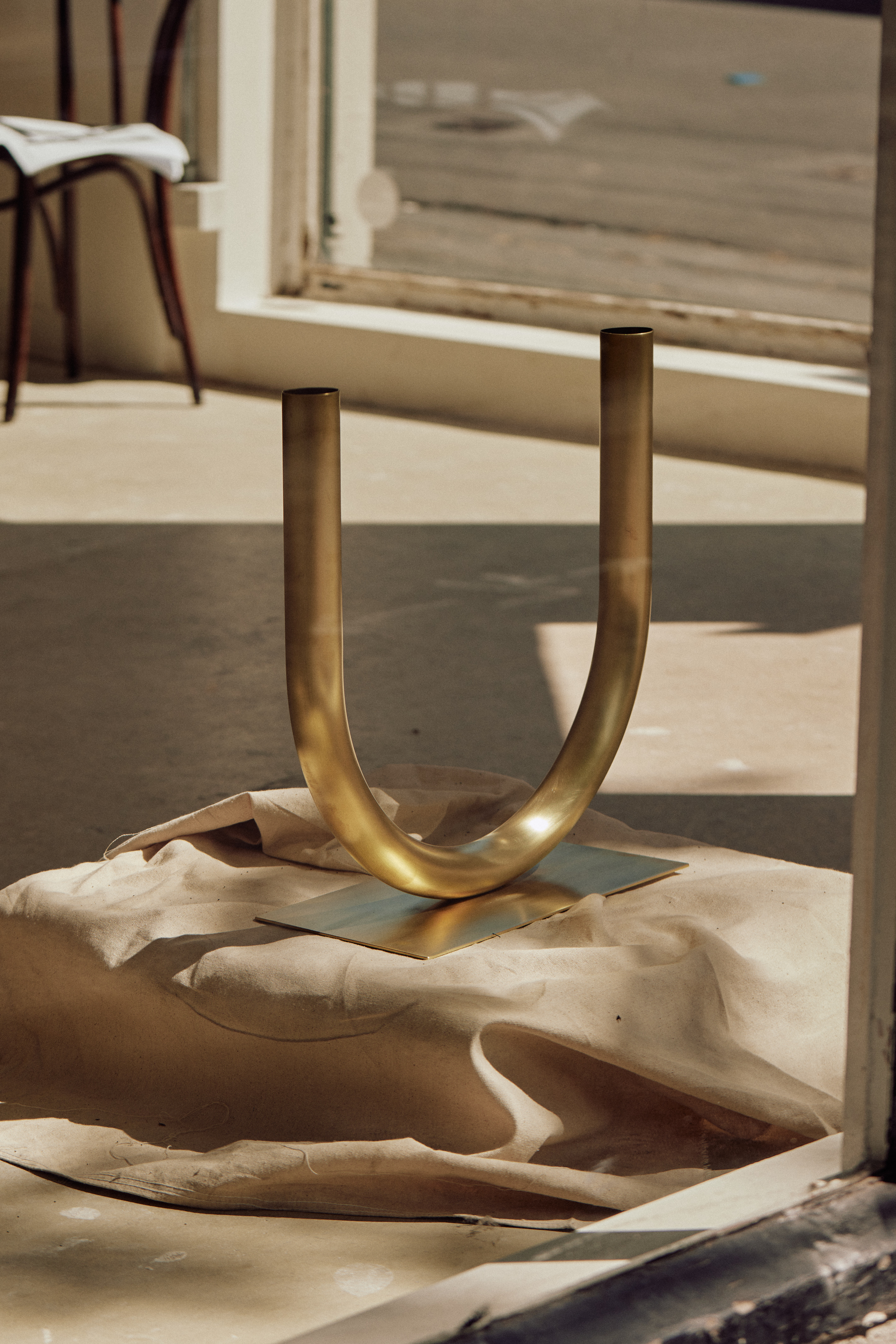 Conceived as intriguing sculptural forms that also perform as vessel bodies, Anna Varendorff’s latest collection of pieces presented at Oigåll are an ongoing extension of her established practice. With their solid materiality, formed by hand from stainless steel and brass - and their clean, negotiated compositions of tight curves, gentle loops and long rigid lines - Varendorff crafts objects that stand alone as examples of brilliant, thoughtful design, while also existing in a beguiling dialogue with the organic, rambling cuttings and flowers that they often display. Having evolved in scale and function over time, these forms also engage directly with the viewer, extending flora and foliage above the head and offering new vantages of display and perspective.